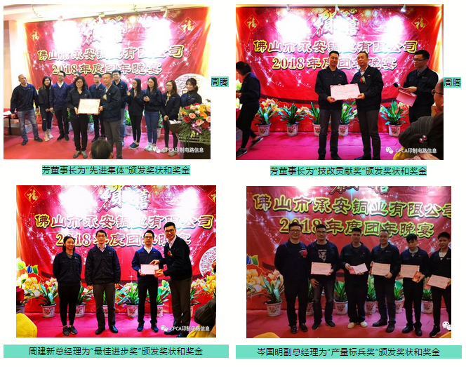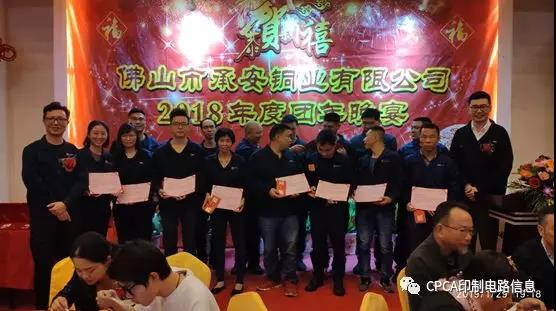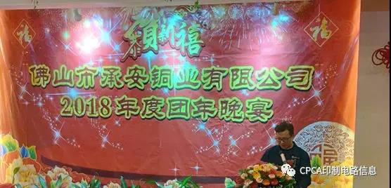 2019年129日晚,佛山市承安铜业有限公司在公司行政楼隆重举行2018年度团年晚宴;周腾芳董事长、周建新总经理、岑国明副总经理及公司全体员工参加了团年晚宴;中国电子电路行业协会(CPCA)顾问梁志立高工、广东省电路板行业协会副秘书长陈世荣副教授等嘉宾也参加了晚宴。