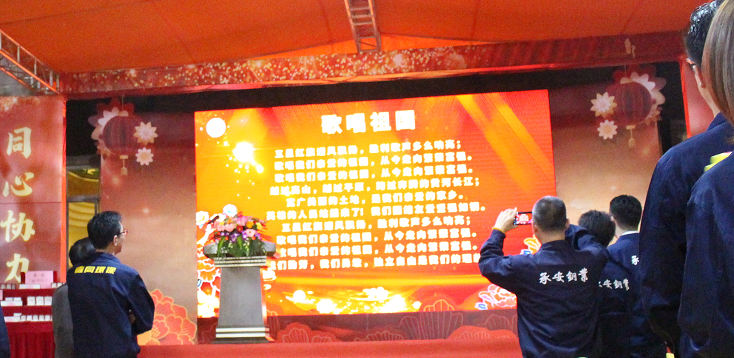 团年晚宴以一首《歌唱祖国》在董事长周腾芳、总经理周建新、副总经理岑国明的带领下,全体员工高歌齐唱,向刚刚过去的祖国70周年华诞致礼,向我们深爱的伟大祖国深情表白,同时也拉开了本次团年晚宴的序幕。
